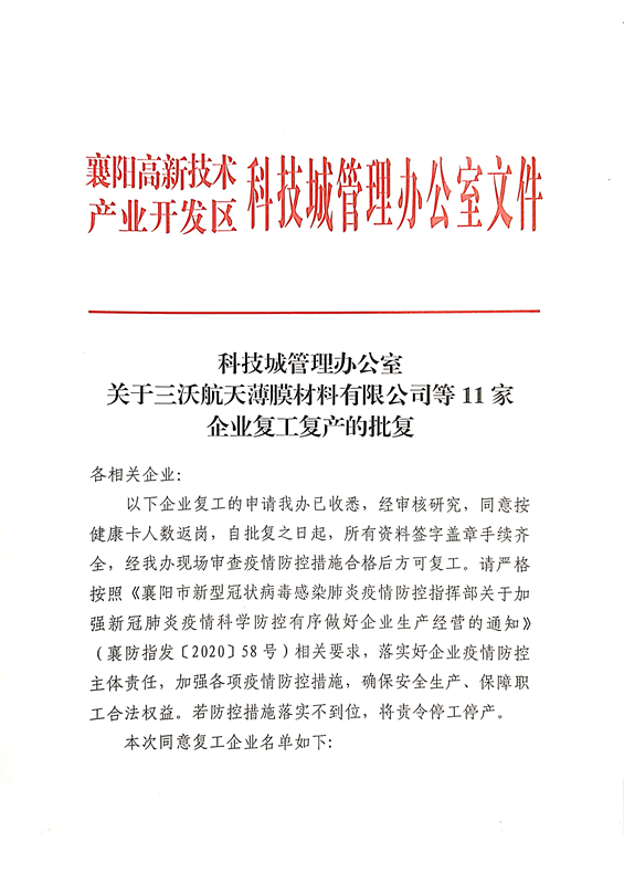 3月20,湖北展高機械裝備有限公司被高新區(qū)正式批復復工復產(chǎn)!